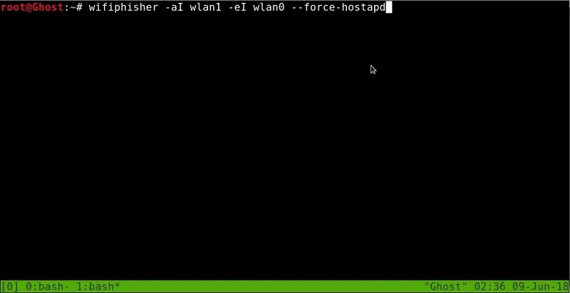 wifiphiser -aI wlan1 -eI wlan0 --force-hostapd Parameter -aI will be the network interface which will activate our fake access point and parameter -eI will indicate the interface that will perform the de-authentication. * —force-hostapd it is not necessary, I use it for problems with the default program which is using WifiPhiser to activate our access point