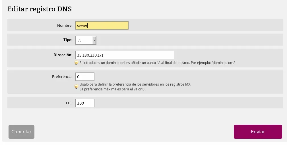En este caso crearemos server.ironhackerspanel.xyz Después tendremos que crear otro subdominio con un registro NS que resolverá el DNS hacía el subdominio anterior.