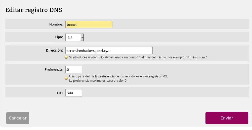 tunnel.ironhackerspanel.xyz será el subdominio con el registro NS. La tabla de registros DNS quedará de la siguiente manera: