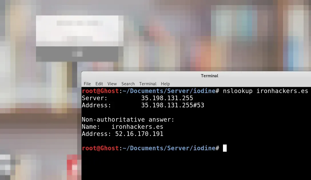 nslookup ironhackers.es Como la resolución funciona podemos probar a realizar un tunel DNS que encapsule el tráfico TCP. Para esta técnica necesitaremos un servidor accesible con SSH,un dominio bajo nuestro control y crear una serie de registros DNS. Yo en mi caso tengo el dominio ironhackerspanel.xyz El primer paso será la creación de un subdominio que apunte al servidor accesible que será a través del cual navegaremos simulando un servidor DNS.
