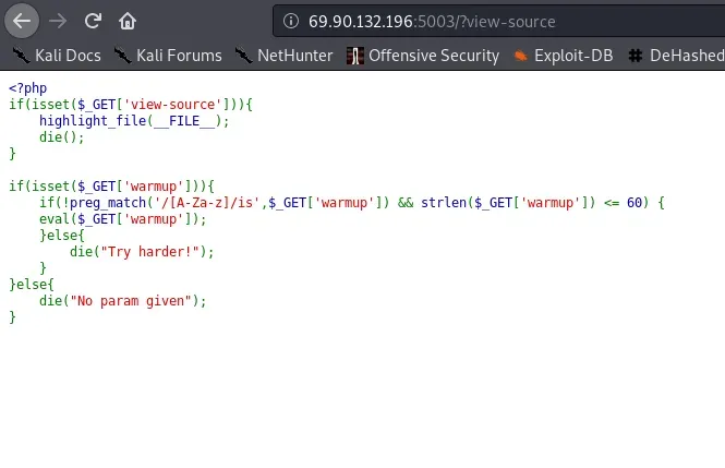 Al acceder al link proporcionado vemos el código fuente del reto. Esto es una pista que permite conocer el funcionamiento interno.