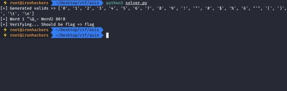expected = "flag.php" word3, word4 = get_xor_strings(expected, valids) print("[+] Word 1 {}- Word2 {}".format(word1, word2))
