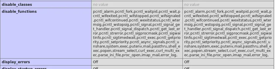 Obtenemos el contenido de la pagina generada al ejecutar phpinfo(), nuestro payload funciona. Al leer la página resultante nos damos cuenta de que existen funciones deshabilitadas.
