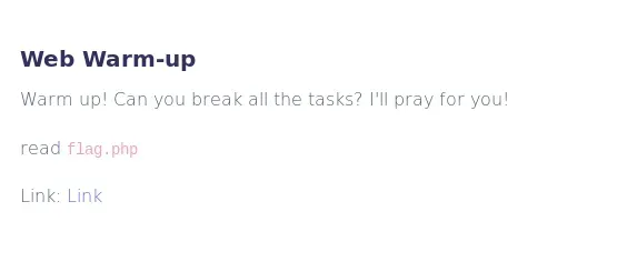 Como se puede ver en la imagen se nos proporciona un enlace a la web que tenemos que romper y una pequeña pista que nos dice que la flag se encuentra dentro del archivo flag.php