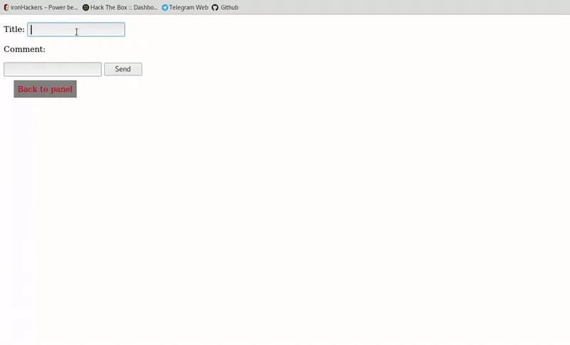 Una vez registrado puedo acceder a ver los mensajes de los usuarios y a lo que nos interesa a nosotros que es la subida de un nuevo comentario. Según el formato de la página podremos inyectar XSS en el campo del comentario añadiendo un script de Javascript como este: