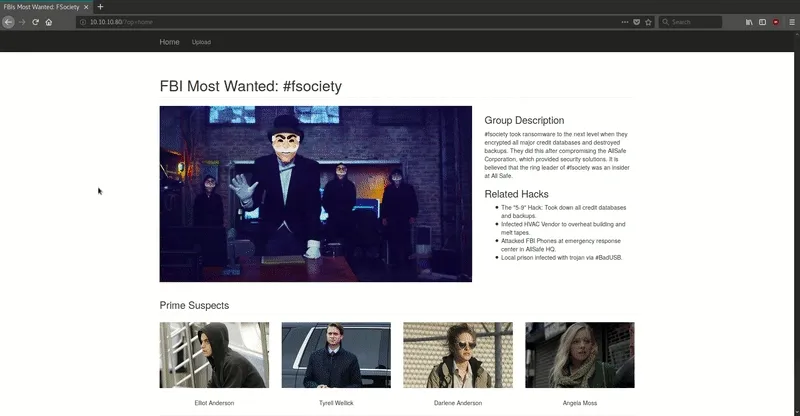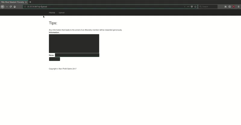 Solo tenemos el puerto 80 (http) así que vamos a revisar la web. Tal y como vemos en el GIF, vemos un portal inspirado en Mr. Robot que nos permite enviar notas para ayudar al fbi para capturar a los miembros de ‘FSociety’.