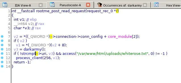 En la función rootme_post_read_request comprueba que la cadena que le pasamos es la correcta para otorgarnos shell root.