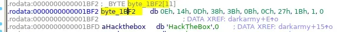 int byte_1BF2[11]={0x0e, 0x14, 0x0d, 0x38, 0x3b, 0x0b, 0x0c, 0x27, 0x1b, 0x1, 0x0}; char aHackTheBox[11]= "HackTheBox"; int i;