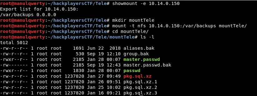 rpcinfo 10.14.0.150 showmount -e 10.14.0.150 mkdir mountTele mount -t nfs 10.14.0.150:/var/backups mountTele/