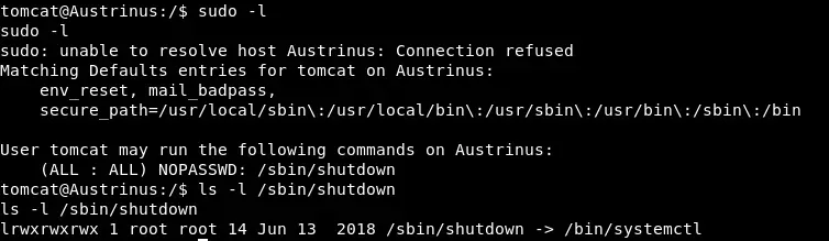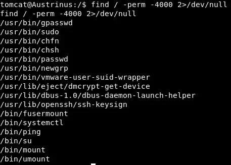 Como veis, el usuario tomcat puede ejecutar como root el comando /sbin/shutdown Además vemos que dicho binario apunta a /bin/systemctl lo cual no es raro. Otro paso común, como vimos en la primera maquina de este ctf, es revisar los binarios con el bit Setuid activo: