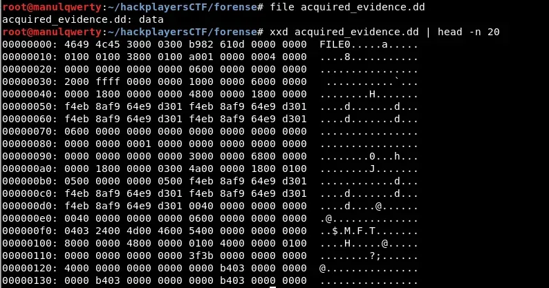 Se nos entrega el fichero acquired_evidence.dd Tratemos de ver qué tipo fichero se nos ha entregado:
