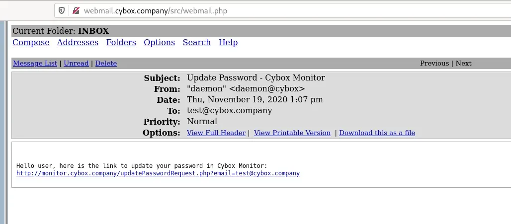 Desde el webmail vemos el correo de restablecimiento de la contraseña. Se observa el parametro pasado por GET en el que se indica el correo electrónico para el cambio de contraseña. Como conocemos el email de admin:admin@cybox.company procedemos a intentar realizar el cambio para este usuario.