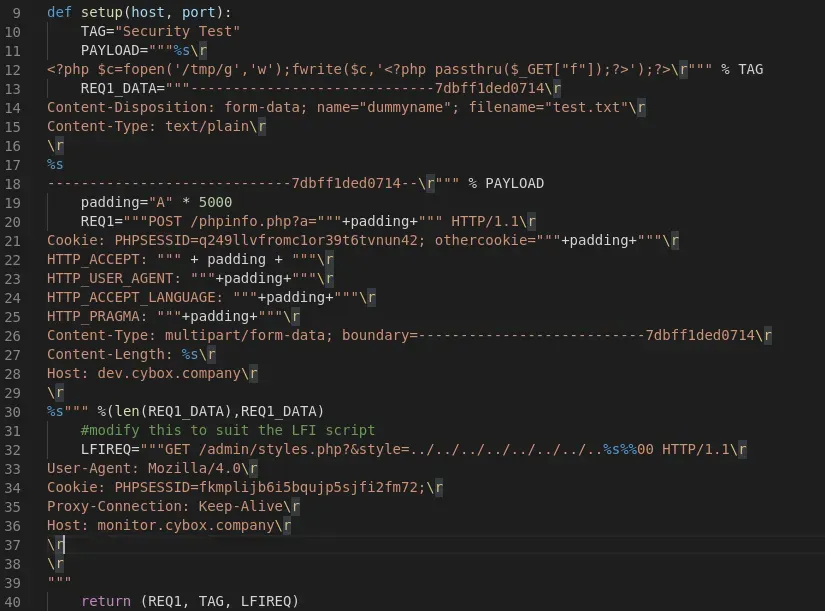 Esta técnica y el exploit utilizado se encuentran en esta entrada del blog de hackplayers. Tenemos un LFI y además tenemos acceso al phpinfo por lo que cumplimos los requisitos para hacer uso de esta condición de carrera. Debemos descargar el exploit y realizar una serie de modificaciones. Se modifica el host de la petición al LFI para que apunte al virtualhost correcto e igual con la que el exploit realiza al phpinfo. También se debe establecer la cookie de sesión ya que el LFI requiere estar autenticado.