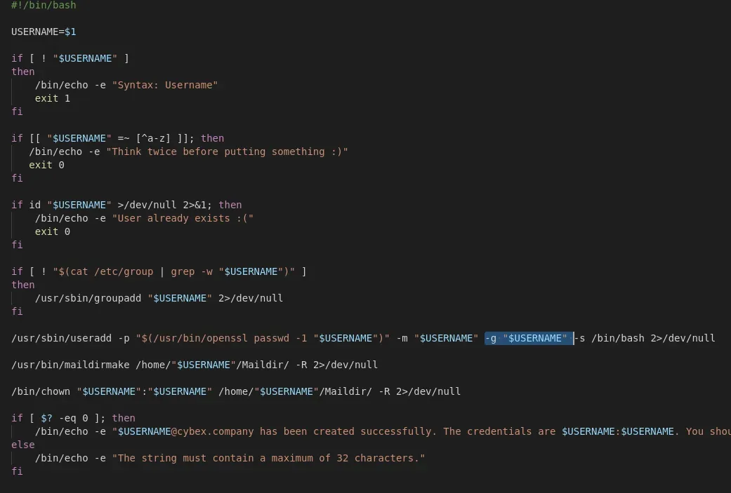El script crea un usuario con el nombre pasado como parámetro y este se añade al grupo con el mismo nombre. Esto es un fallo ya que podemos crear un usuario con nombre sudo que pertenecera al grupo sudo obteniendo acceso como administrador y consiguiendo la flag de root.