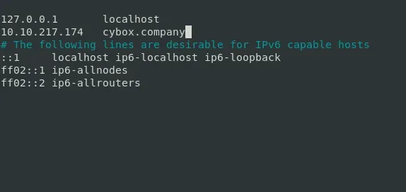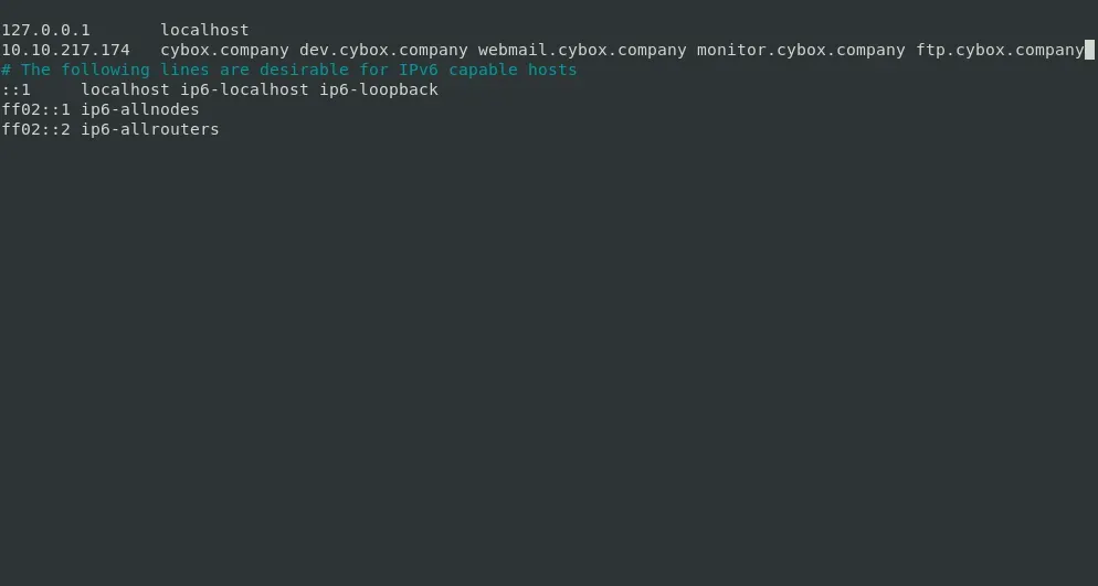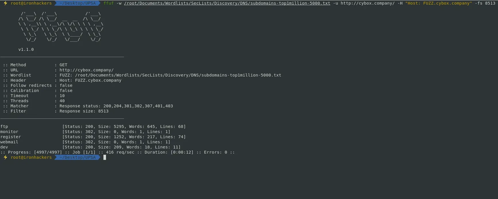 ffuf -w /root/Documents/Wordlists/SecLists/Discovery/DNS/subdomains-top1million-5000.txt -u http://cybox.company/ -H "Host: FUZZ.cybox.company" -fs 8513 Hemos encontrado una serie de subdominios. Para poder analizar las aplicaciones servidas en cada uno de ellos debemos añadirlos también a nuestro archivo /etc/host.