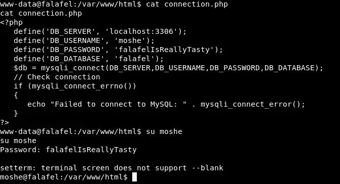 Le echamos un ojo a los ficheros que vemos en /var/www/html; en el connection.php vemos las credenciales: moshe:falafelIsReallyTasty