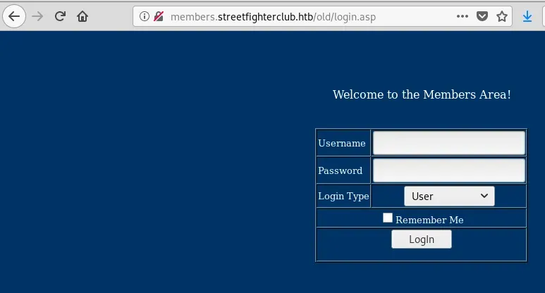 10.10.10.72 members.streetfighterclub.htbFuzzeando encontramos: http://members.streetfighterclub.htb/old/login.asp