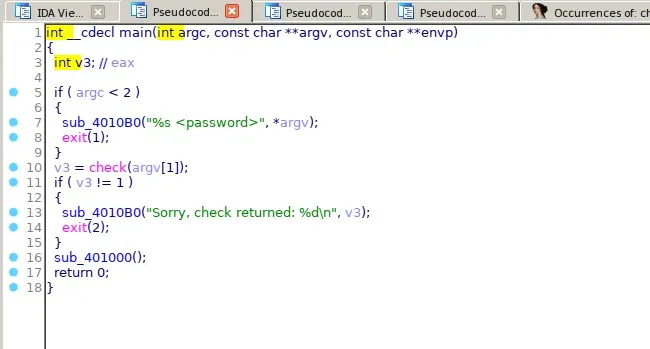 La funcion check() ejecutara XOR con 9 cada caracter de la variable aFmFeholH Para reversear esto me hice un pequeño programa en C, aun que lo mas sencillo seria hacer patching