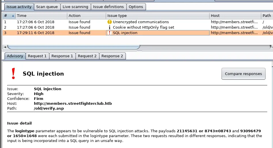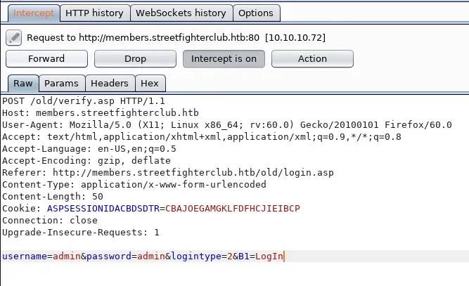 resp = post("http://members.streetfighterclub.htb/old/verify.asp",data=params,allow_redirects=False,cookies={"ASPSESSIONIDCQQARTCC":"OJGJBAHDGMPKEHOFHCKLKDIG"})