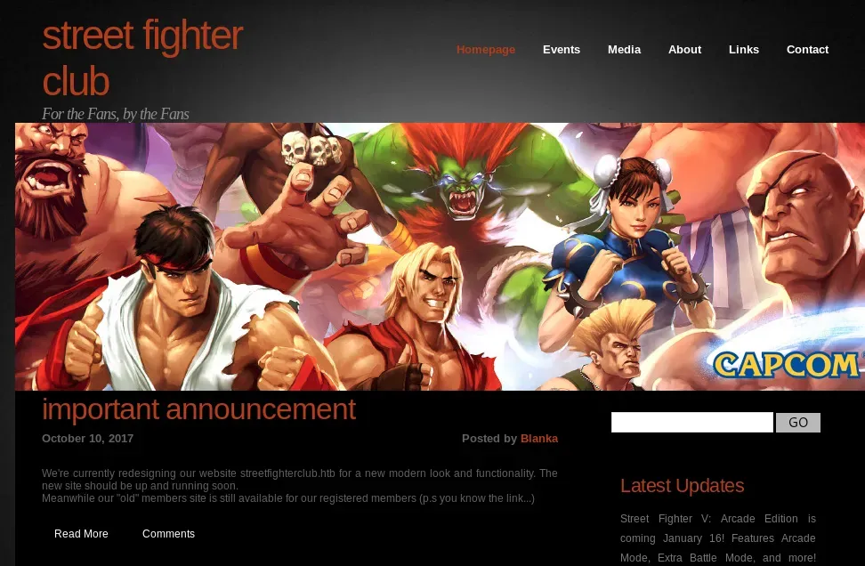 Como leemos en el important announcement se esta desarrollando una web nueva, pero la antigua sigue funcionando, también tenemos el dominio streetfighterclub.htb vamos a buscar el antiguo portal. Tras varias pruebas encontramos el subdominio members.streetfighterclub.htb. Para que nos funcione debemos añadir al /etc/hosts: