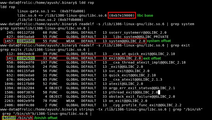 La longitud de nuestro relleno será 52 bytes, busquemos las direcciones de la biblioteca libc, de system, de exit y de /bin/sh.