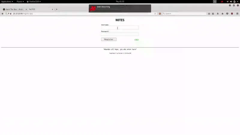 headers1 = {"Accept":"text/html,application/xhtml+xml,application/xml;q=0.9,*/*;q=0.8","Upgrade-Insecure-Requests":"1","User-Agent":"Mozilla/5.0 (X11; Linux x86_64; rv:52.0) Gecko/20100101 Firefox/52.0","Referer":"http://10.10.10.66/notes.php","Connection":"close","Accept-Language":"en-US,en;q=0.5","Accept-Encoding":"gzip, deflate","DNT":"1"}