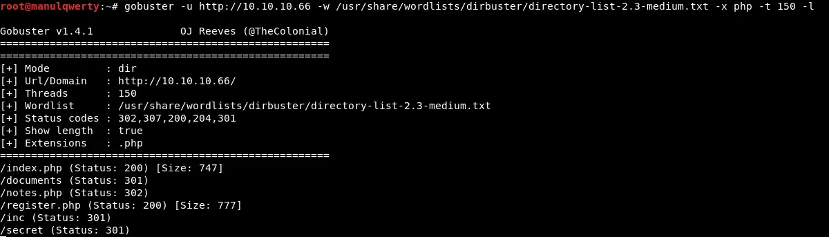 gobuster -u http://10.10.10.66 -w /usr/share/wordlists/dirbuster/directory-list-2.3-medium.txt -x php -t 100 -l