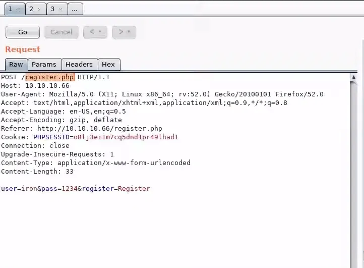 headers0 = {"Accept":"text/html,application/xhtml+xml,application/xml;q=0.9,*/*;q=0.8","Upgrade-Insecure-Requests":"1","User-Agent":"Mozilla/5.0 (X11; Linux x86_64; rv:52.0) Gecko/20100101 Firefox/52.0","Referer":"http://10.10.10.66/register.php","Connection":"close","Accept-Language":"en-US,en;q=0.5","Accept-Encoding":"gzip, deflate","DNT":"1","Content-Type":"application/x-www-form-urlencoded"} paramsPost0['user'] = payload