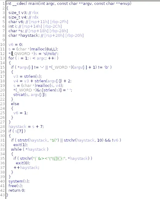 if (s[7]){ if (strstr(haystack,"$(") || strchr(haystack,'\\n') && !v6) printf("exit(1)\\n"); while (*haystack){ if (strchr("|`&><'\"\\\\[]{};", *haystack)) printf("exit(0)\\n"); ++haystack; } }
