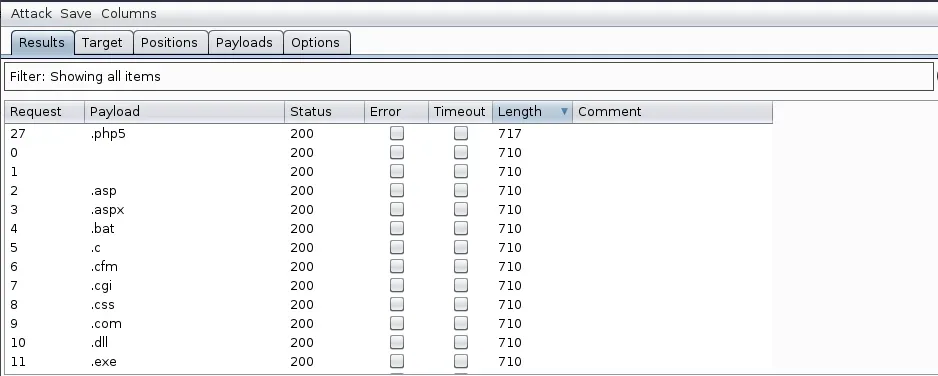 Tras ejecutarlo y ordenar los resultados por el tamaño de la respuesta, encontramos que se nos permite subir fichero con extensión .php5: