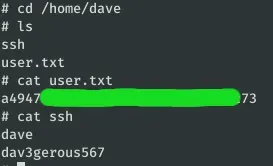 En el directorio /home/dave encontramos las credenciales del SSH y el flag de usuario: