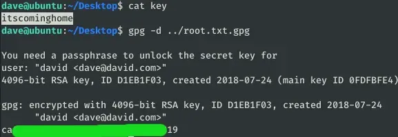 En esta máquina nos encontramos un fichero: root.txt.gpg, vamos a descargarlo en la máquina “ubuntu”: