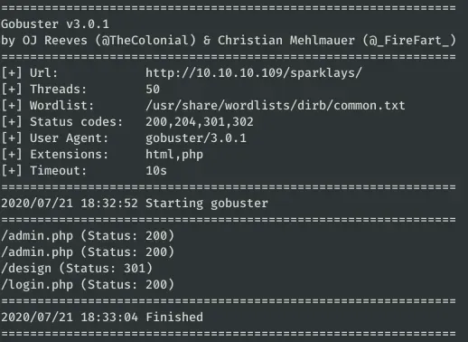 gobuster dir -u http://10.10.10.109/sparklays/design/ -w /usr/share/wordlists/dirb/common.txt -x html,php -t 50 -s 200,204,301,302